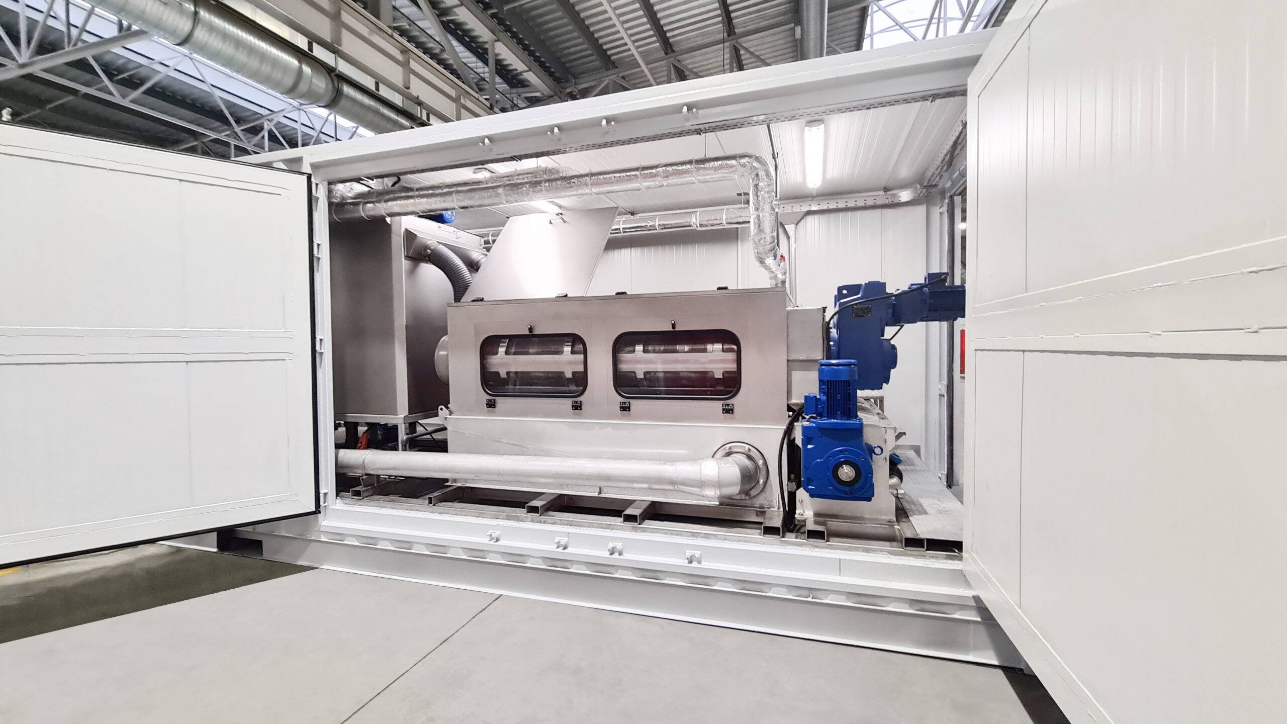 The containerized mechanical sludge dewatering plant can be equipped with an integrated air purification system that minimizes odor emissions and reduces the required sanitary protection zones.