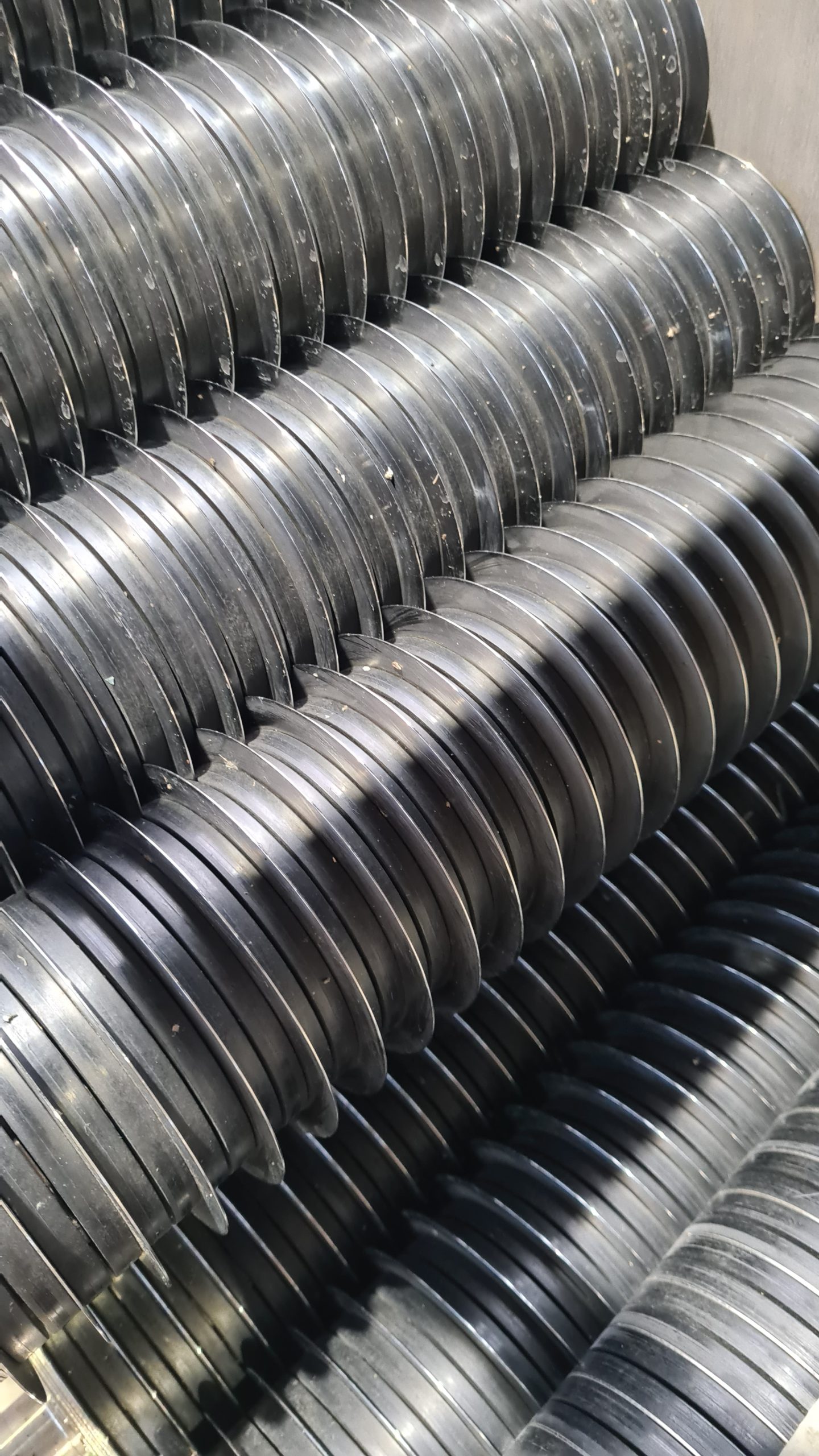 JD roller presses utilize both gravity filtration and pressure dewatering systems. The “filtering rollers” consist of alternating thin metal discs and resin discs, and are arranged in two (upper and lower) tiers. The flocculated sludge is fed between the rollers and dewatered by compression while being conveyed toward the sludge outlet by the rollers rotation. Not only is the system highly energy efficient, the discs are self-cleaning and do not clog.